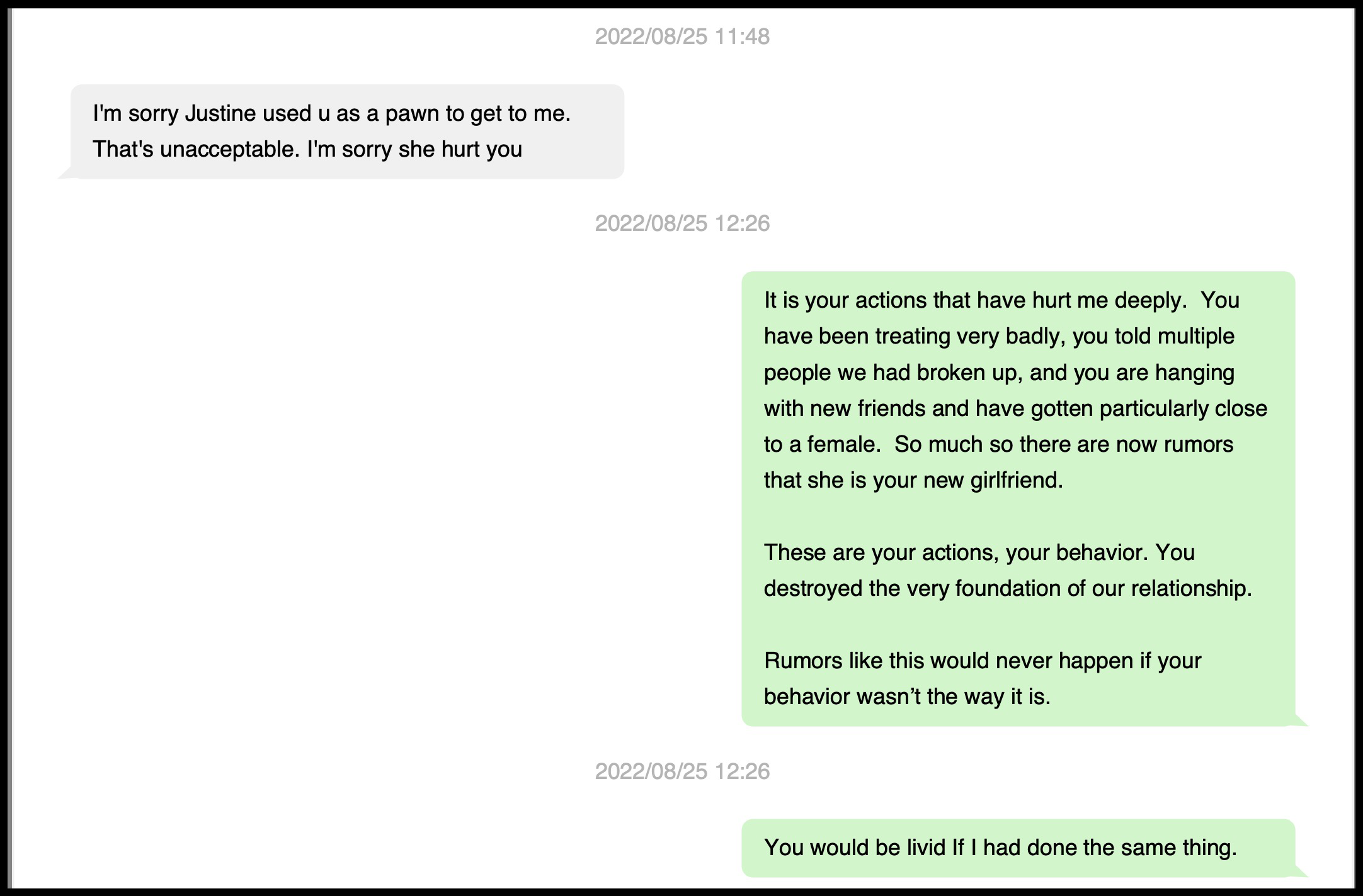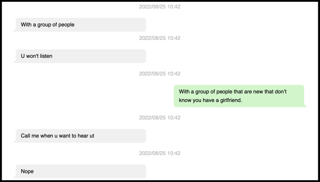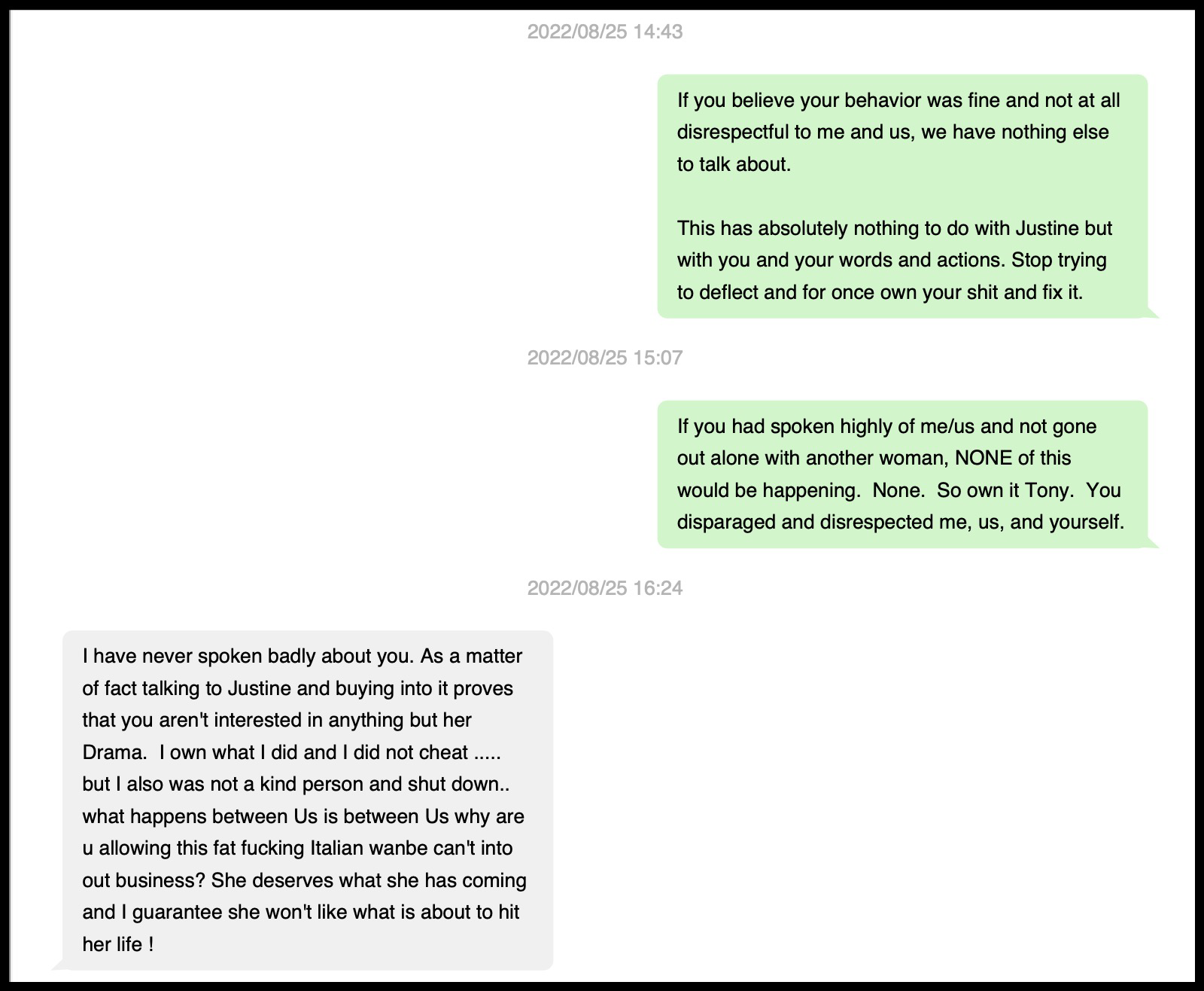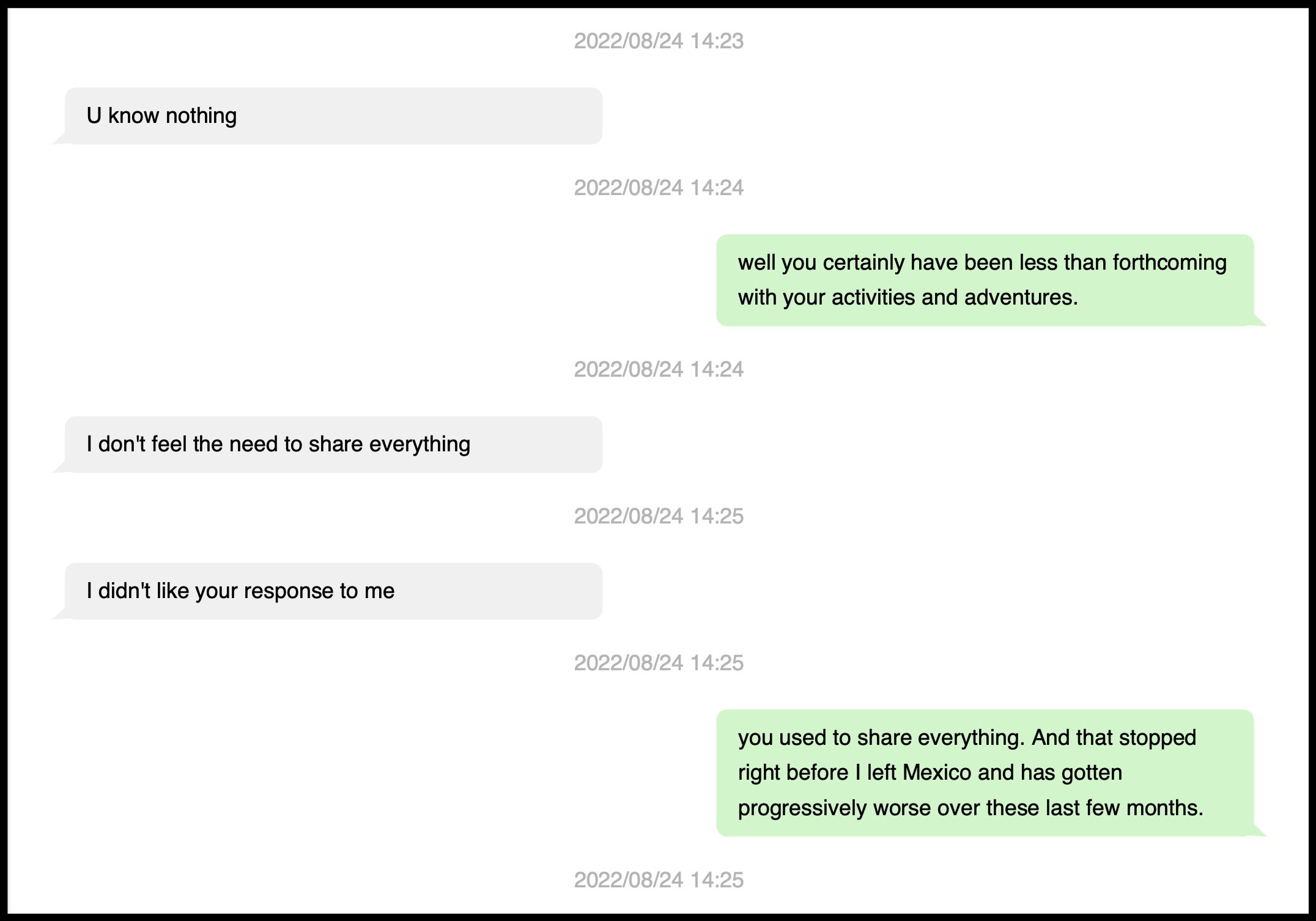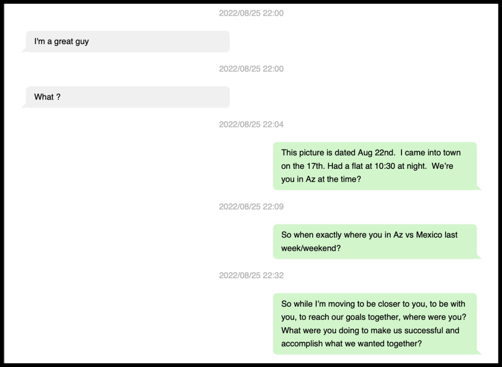 One story he shared with me was when I was living with him (2022) and we were visiting a new-to-me neighborhood in Rocky Point Mexico. As we were driving and walking around, he shared the following story with me: He said that he had stayed a long weekend with Betsy at this location and they fought a lot while on that trip because she was insecure. I asked him if he had cheated on her, he was adamant he didn’t. He did say that he was on a break from Lola and JustineB when he hooked up with Betsy. Then he went back to one of these girls (not sure who). Betsy was upset about him not wanting to be with her that she began stalking him.