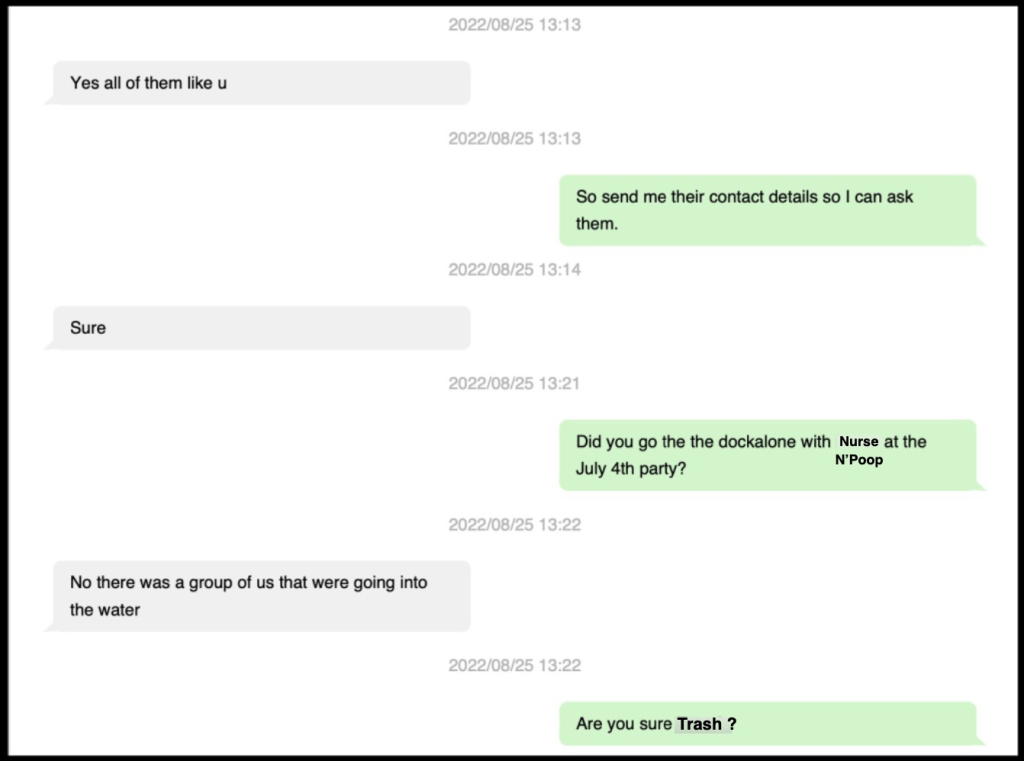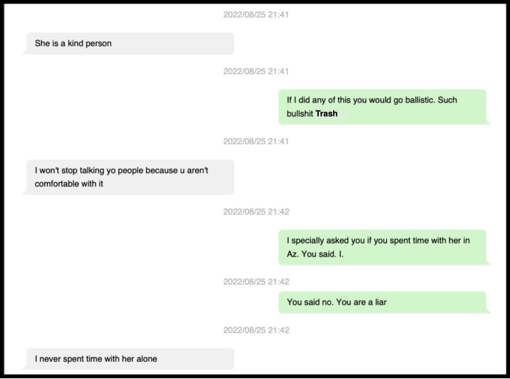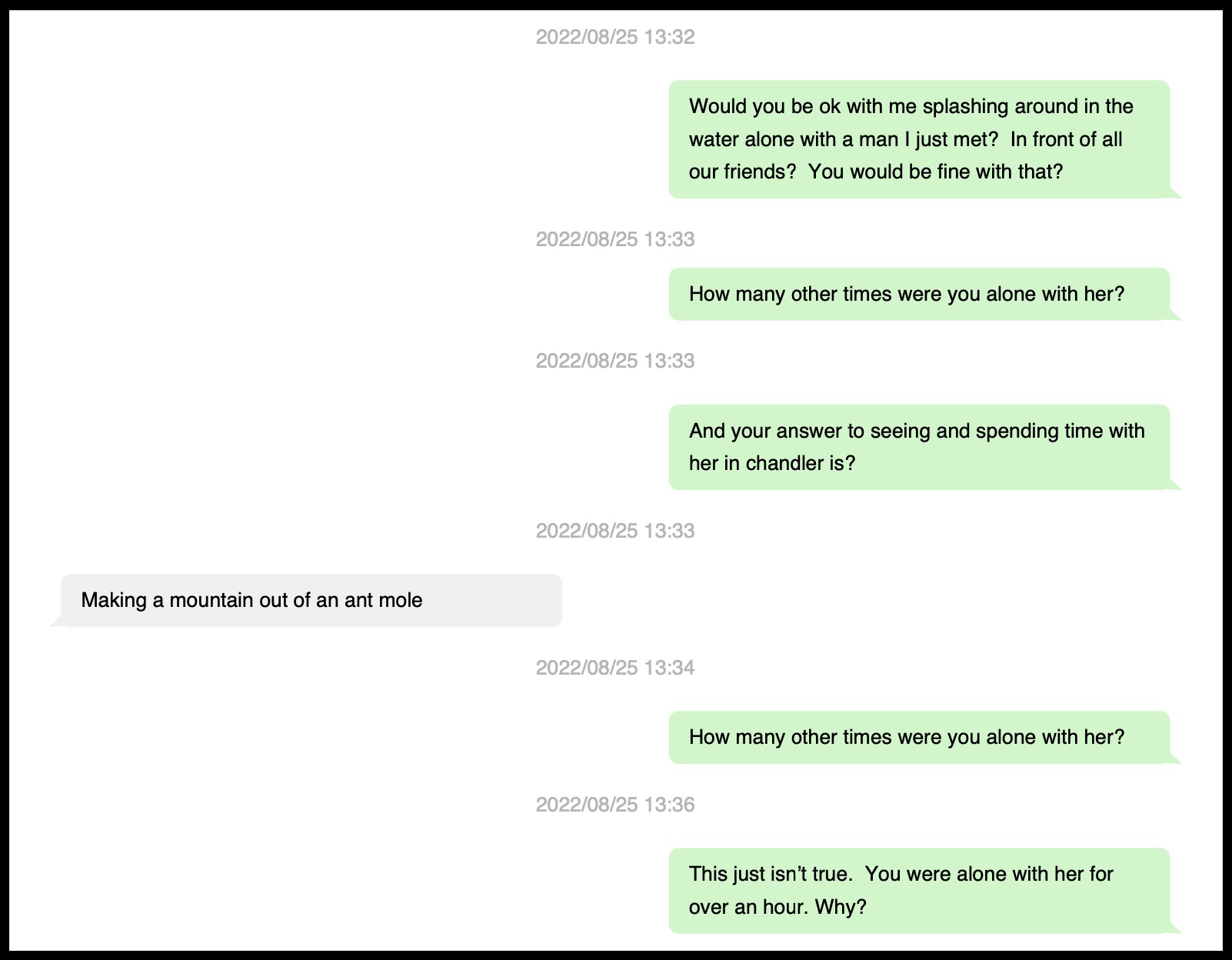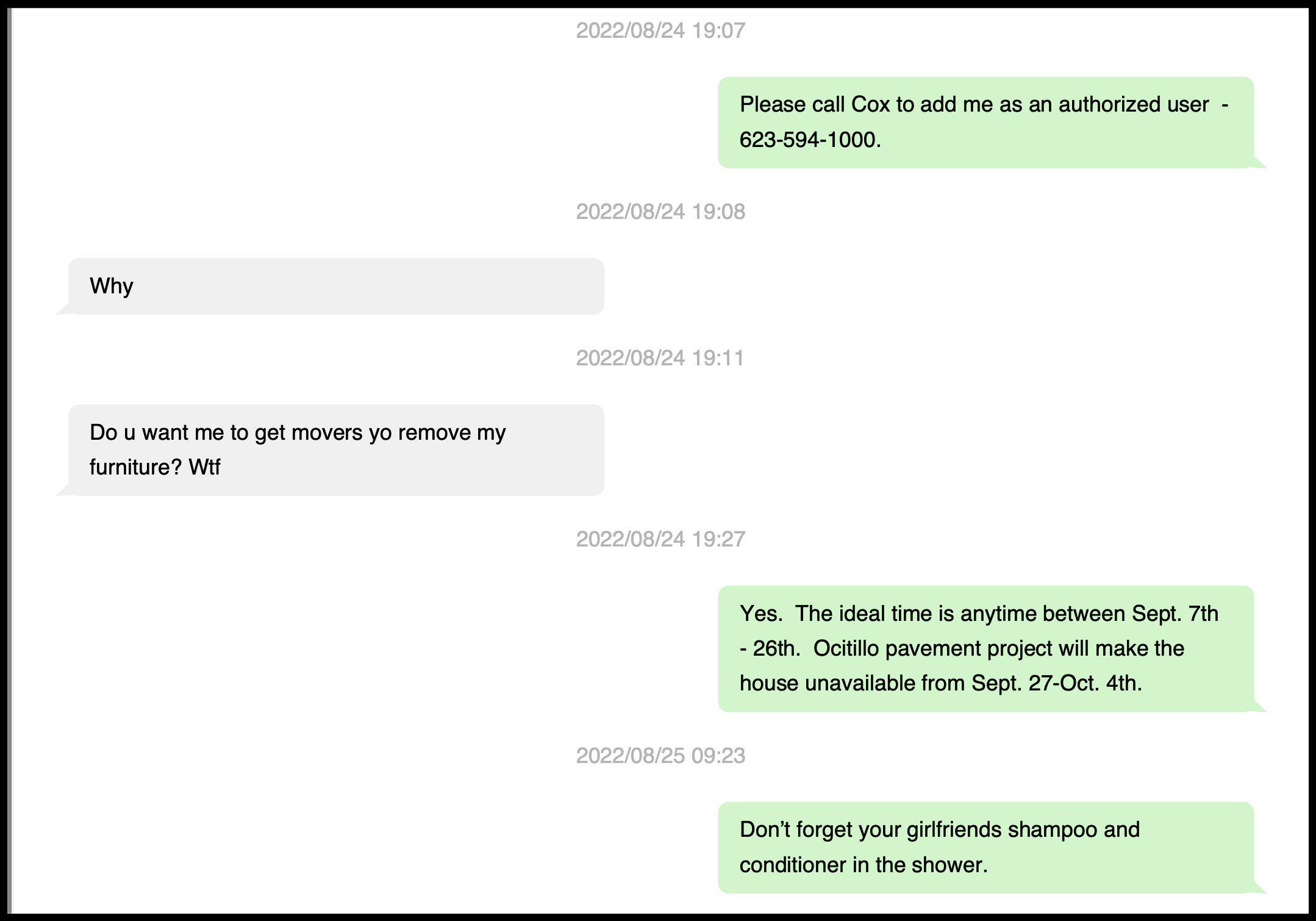 A particularly harrowing experience for Lola was when Trash was at the Chandler house in November 2021, I was still in Salt Lake City UT, heading down Arizona within days. Trash and Lola were still texting, meeting up, having sex, all that jazz. I was NOT aware of this at the time. Well, at some point he was at the Chandler house, she was aware he had cleared out the storage room and wanted some of her things back. He invited her to the Chandler house… when she walked into the home, she was stunned to see all of her stuff. She wanted to take it. He got mad at her, hit her, then dragged her out of the house by her hair and arms. He called the police and when they showed up he wanted her arrested for trespassing. They would NOT arrest her for trespassing because she showed them the text exchange between she and Trash where he clearly invited her over. She wanted to file a police report for theft and for attacking her, but they told her, “if you do that you are both going to jail”. She had two young boys at home and couldn’t go to jail…. so she left with her TV and massive scrapes and bruises. I have seen the pictures – her hands and wrists were dark purple and red… her entire back had a road rash, much like motorcyclists get when they fall and skid across the pavement. This is so infuriating to me on several notes: