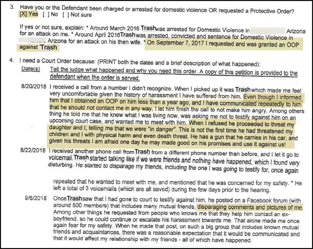 In 2018, Trash reaches out to her just before the 2017 OOP expires, acting like nothing was wrong and then threatens her and her kids when she won’t talk to him or do what he requests. She files for and is granted another OOP.