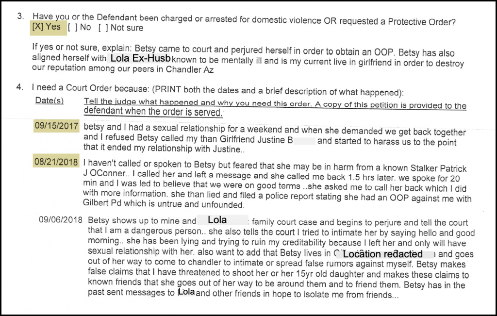 I was in shock reading these documents. At the time I found these documents, Trash was doing the very same thing to me! I was back in Arizona after the eviction was upheld and had just filed for my own OOP against him when I learned that he filed an OOP while I was in Mexico, painting himself as the victim, and trying to get “exclusive access” to MY home (in an attempt to mute the eviction). I had no idea how to navigate the system, and clearly he knew all too well how to use the justice system to further hurt his victims. What he was doing to me was EXACTLY what he had done to Betsy years earlier. My heart broke for Betsy.