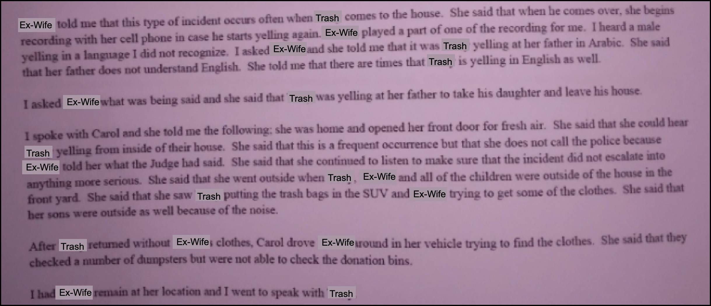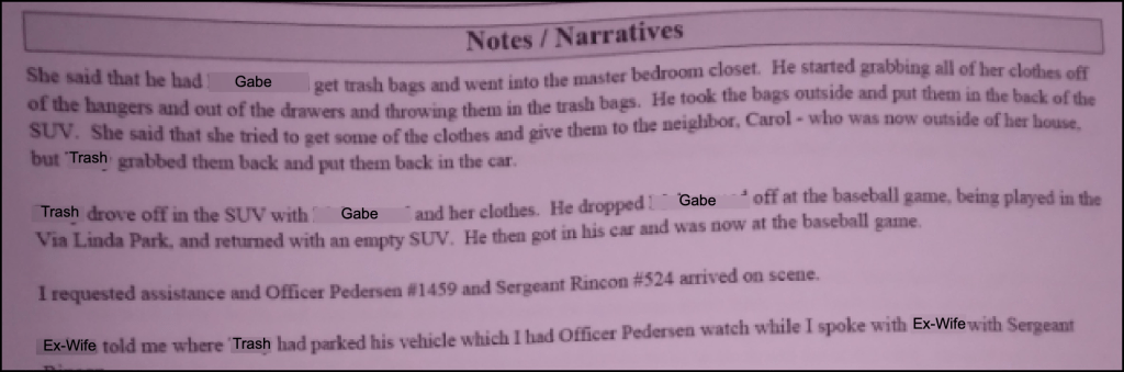In March 2016 he stopped by the house to pick up Gabe for baseball, they got into an argument. He dragged her out of the house by her hair. He threw her clothes away. The police were called. Trash was arrested for Disorderly Conduct – Disruptive Behavior, Disorderly Conduct – Language/Gesture, Interference with Court Order / Violation of Court Order.. Here is an excerpt from the report: