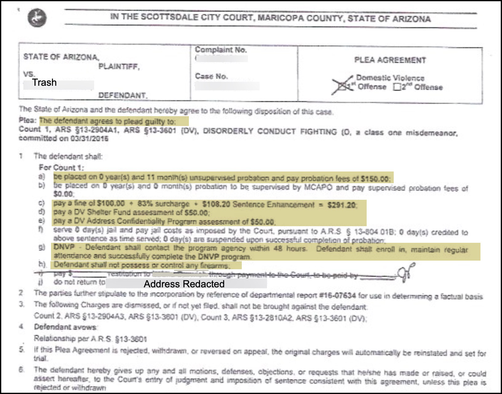 He pled guilty to domestic violence, spent ONE night in Jail, and was fined. This was marked as his first offense, but it was not his first time he abused his wife, it was the first time he was caught (As mentioned in the Report above, The Ex-Wife did NOT call the police when these incidents took place because she was told, by a Judge that she would be arrested if she did). Make it make sense that this is all he gets for physically assaulting his now Ex-Wife.