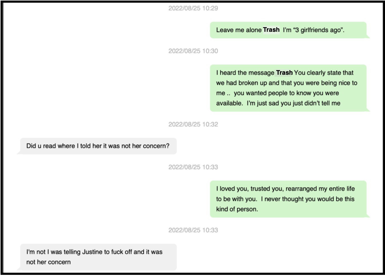 The Constant Harassment and Bullying: The aftermath of the breakup manifested in relentless harassment and systematic bullying orchestrated by Trash. In a blatant violation of the US Order of Protection, my existence was haunted by a series of confrontations and hostilities.