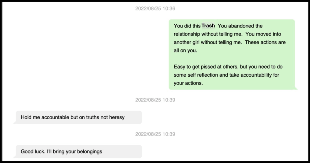 I know this because I found a second OOP in 2018 that stated she had an OOP in 2017. How did I get this document? When I evicted Trash from my home in 2022, he didn’t take his stuff (he took mine). Since he didn’t pick it up, it was mine to dispose of as I saw fit. My lawyer told me the court would look favorably upon me if I went through his stuff and returned “sentimental items“. So yes, not only was I heartbroken, in shock, but I was being told I needed to go through all of Trash’s shit and determine what was sentimental to him and save it so I could return it.