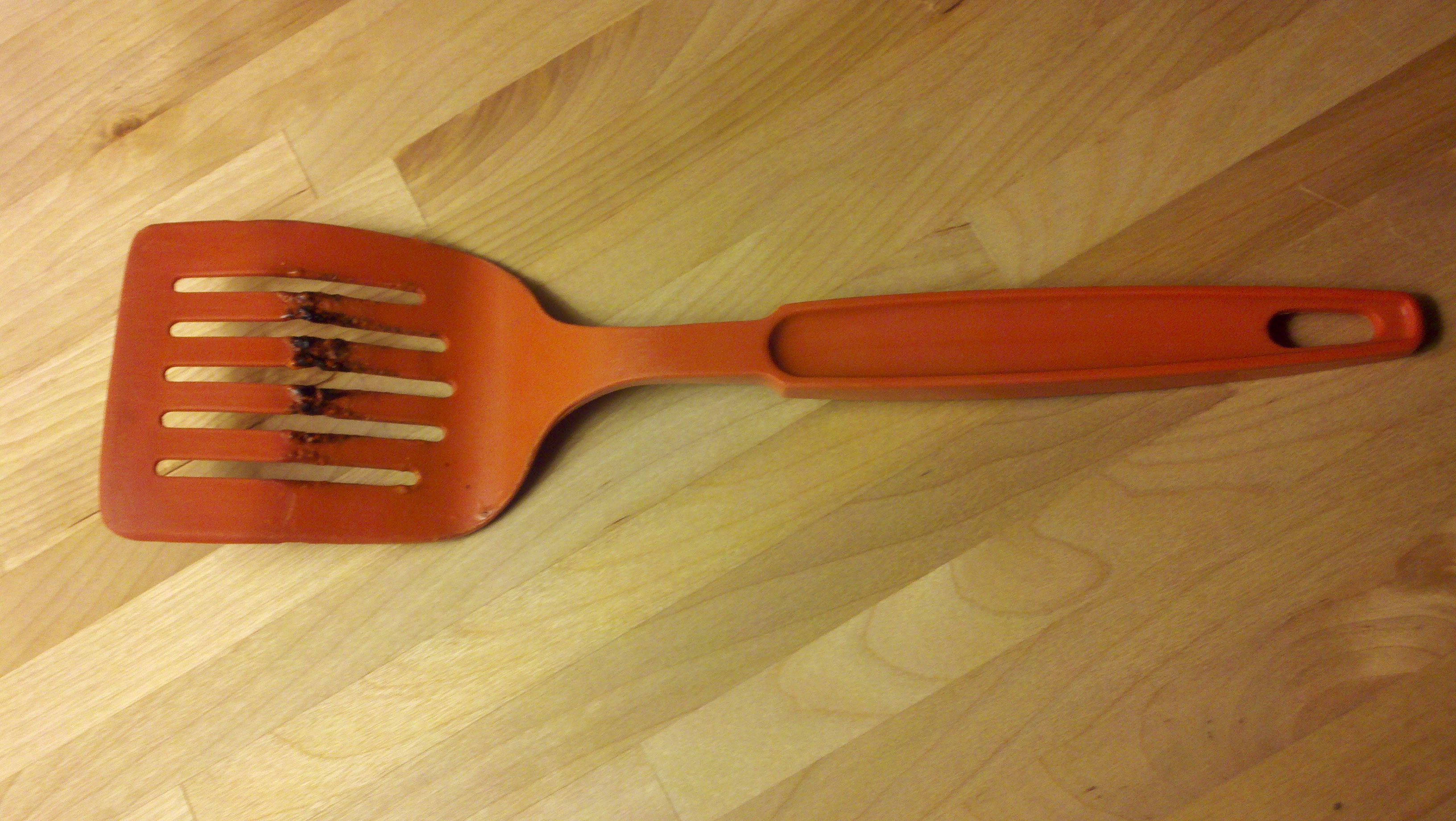 Wow, I think today is the day that I need to recycle my long-lived spatula.  I purchased this gorgeous orange plastic spatula at a Deseret Industries in Utah when I was in college – in 1992.  She has been my trusty grilled-cheese sandwich flipper (in the days that I used to eat carbs), my egg scrambler, my veggie sauter….  my everything kitchen gadget for many many years.  She has been far more dependable than any relationship I’ve had…