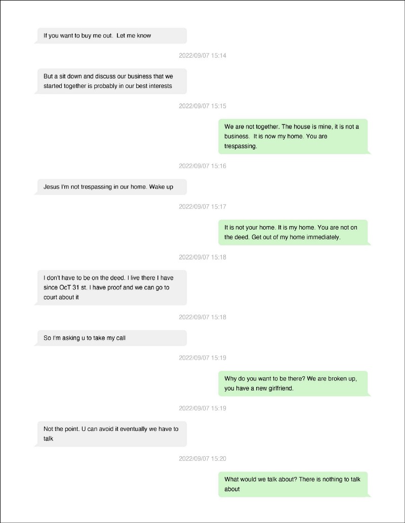 One of the very few times I reached out to Trash first was this exchange — I just wanted him to know where to find his dog Baxter (story for another time). Instead of taking responsibility for his dog, he broke into my house — This is WhatsApp exchange with Trash on Sept. 7th 2022 — Trash is the left side / grey, I am the right side / green: