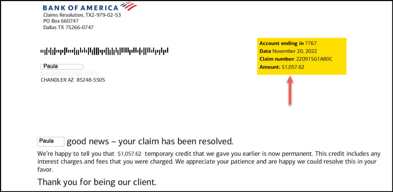 1/31/23 — My bank, Bank of America, called me and told me the transfer had been flagged as fraud and was seeking my approval to return funds. Of course I gave permission and the funds were returned the very same day. Here are the details from my Bank of America statement: